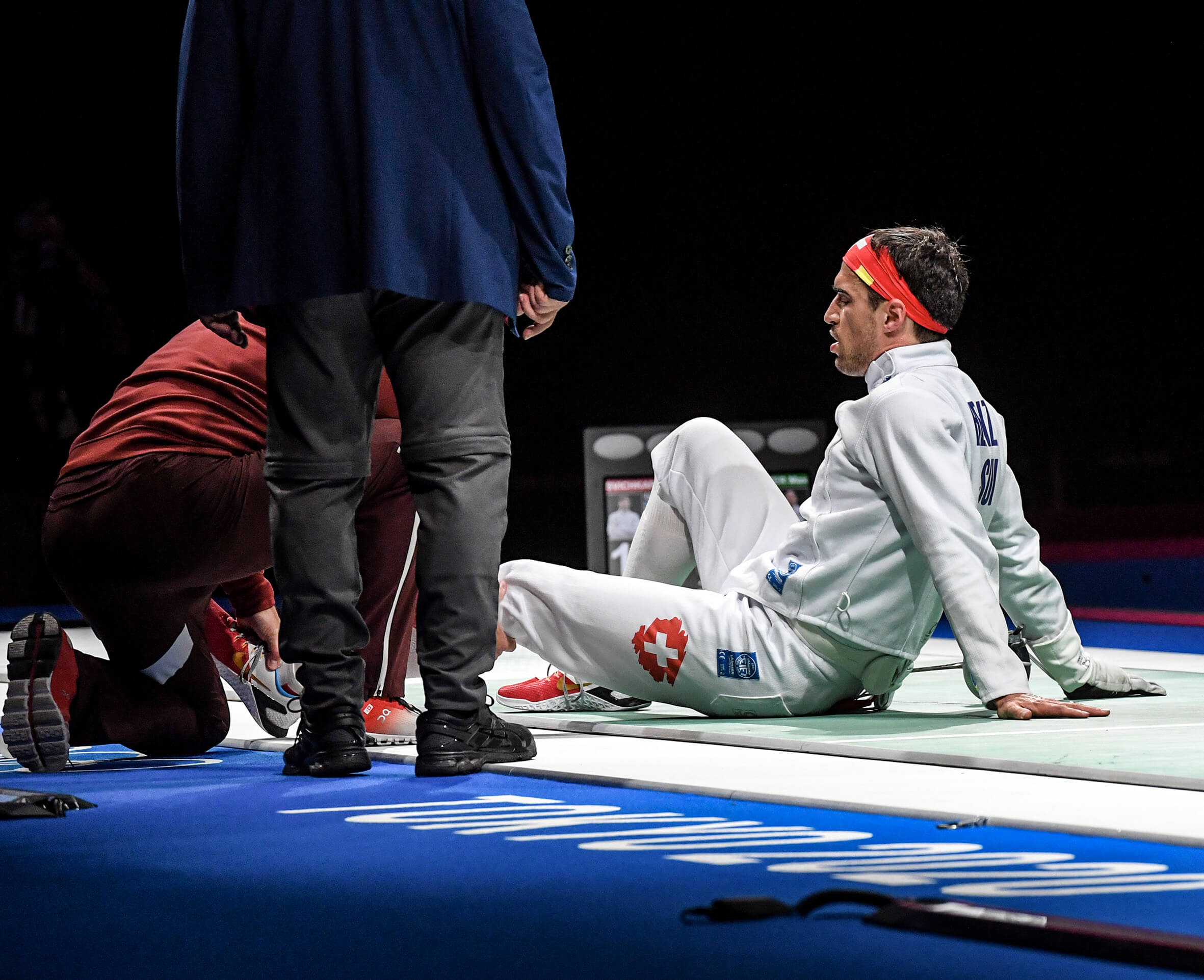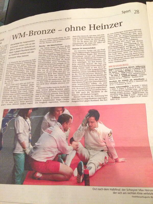 Kazan 2014, im Halbfinal Schlussgefecht gegen Yannick Borel… Der Franzose läuft mit voller Geschwindigkeit seitlich ins Knie von Max. Er und ich waren davon überzeugt, dass eine schwerere Knieverletzung das Resultat war. Die Enttäuschung und der physische Schmerz waren kaum zu bändigen. Zum Glück hat sich die Verletzung als nicht so schwerwiegend herausgestellt und er konnte nach ein paar Wochen wieder angreifen.
